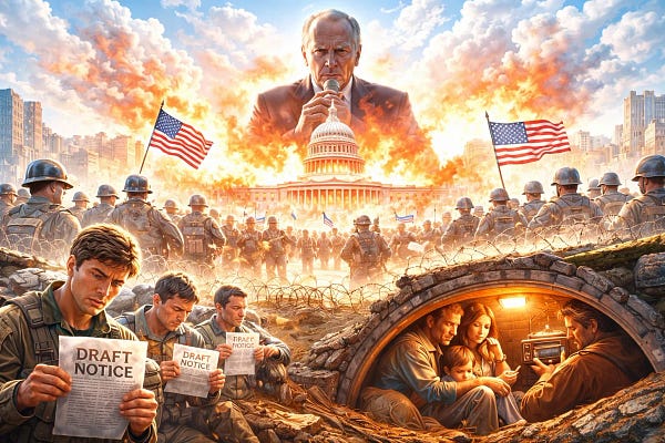 War, drafts, bunkers, and a president holding democracy hostage. This is what America looks like today.