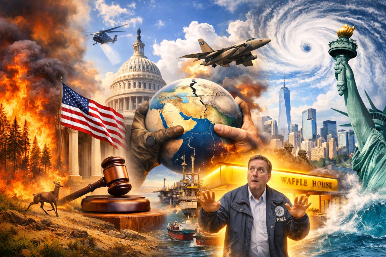 Trump steals oil, ditches allies, blackmails Ukraine, attacks the Constitution, threatens your vote — and his FEMA chief is getting teleported to Waffle House by God. This is America right now.